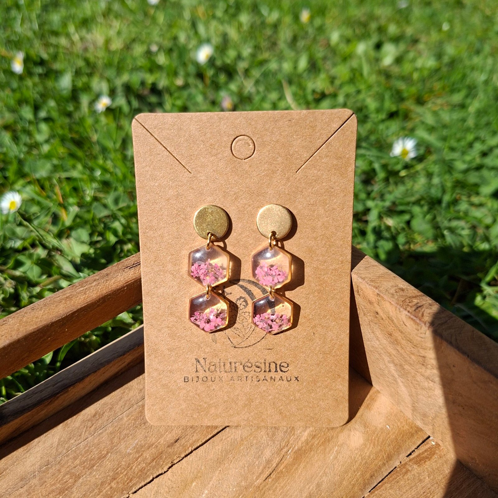 Les boucles d’oreilles Jennifer sont composées de petites fleurs des champs séchées rose clair emprisonnées dans la résine afin de les préserver.