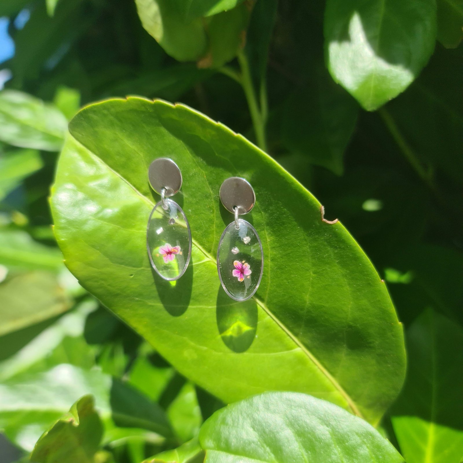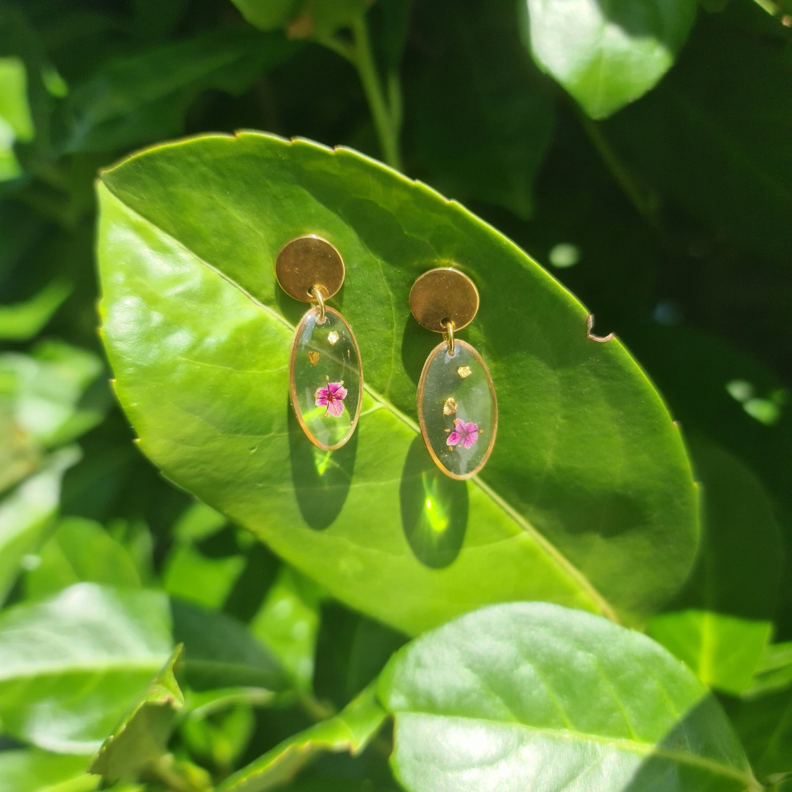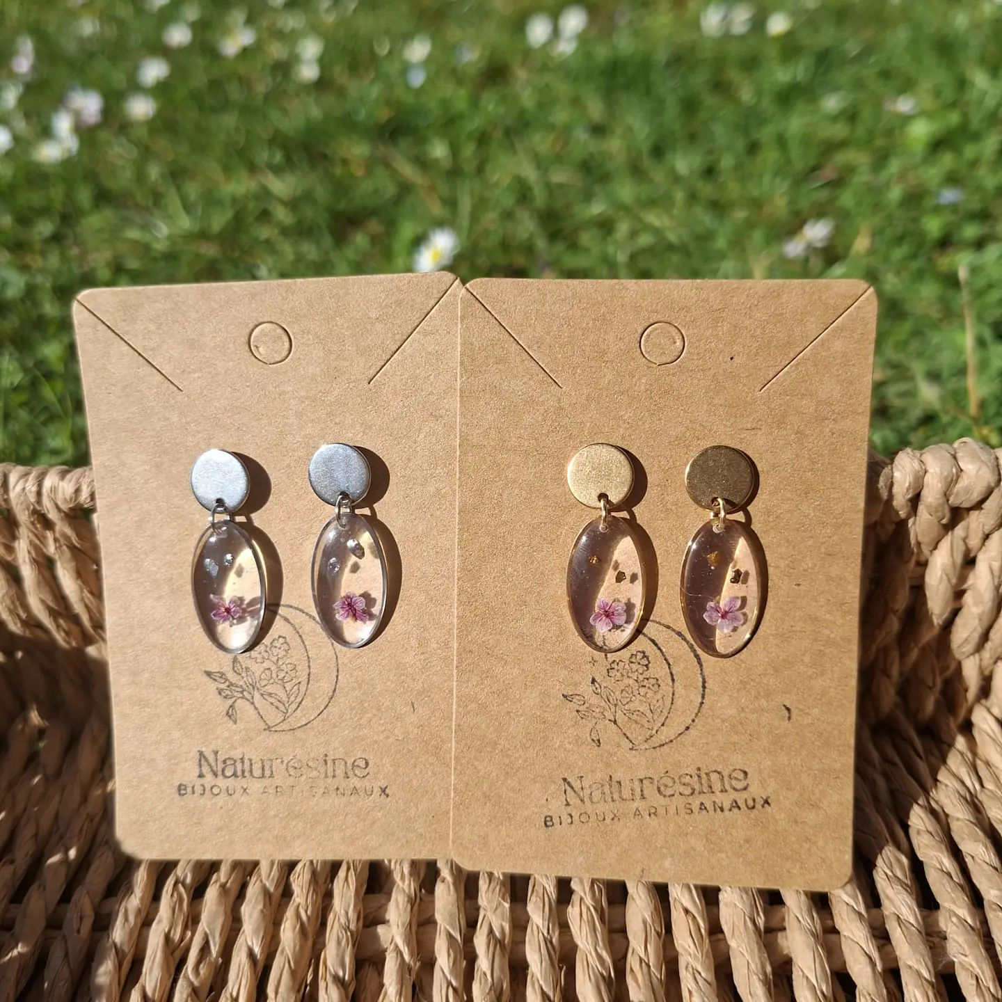 La paire de boucles d’oreilles Cynthia présente un médaillon ovale en résine intégrant de fines fleurs naturelles soigneusement sélectionnées.