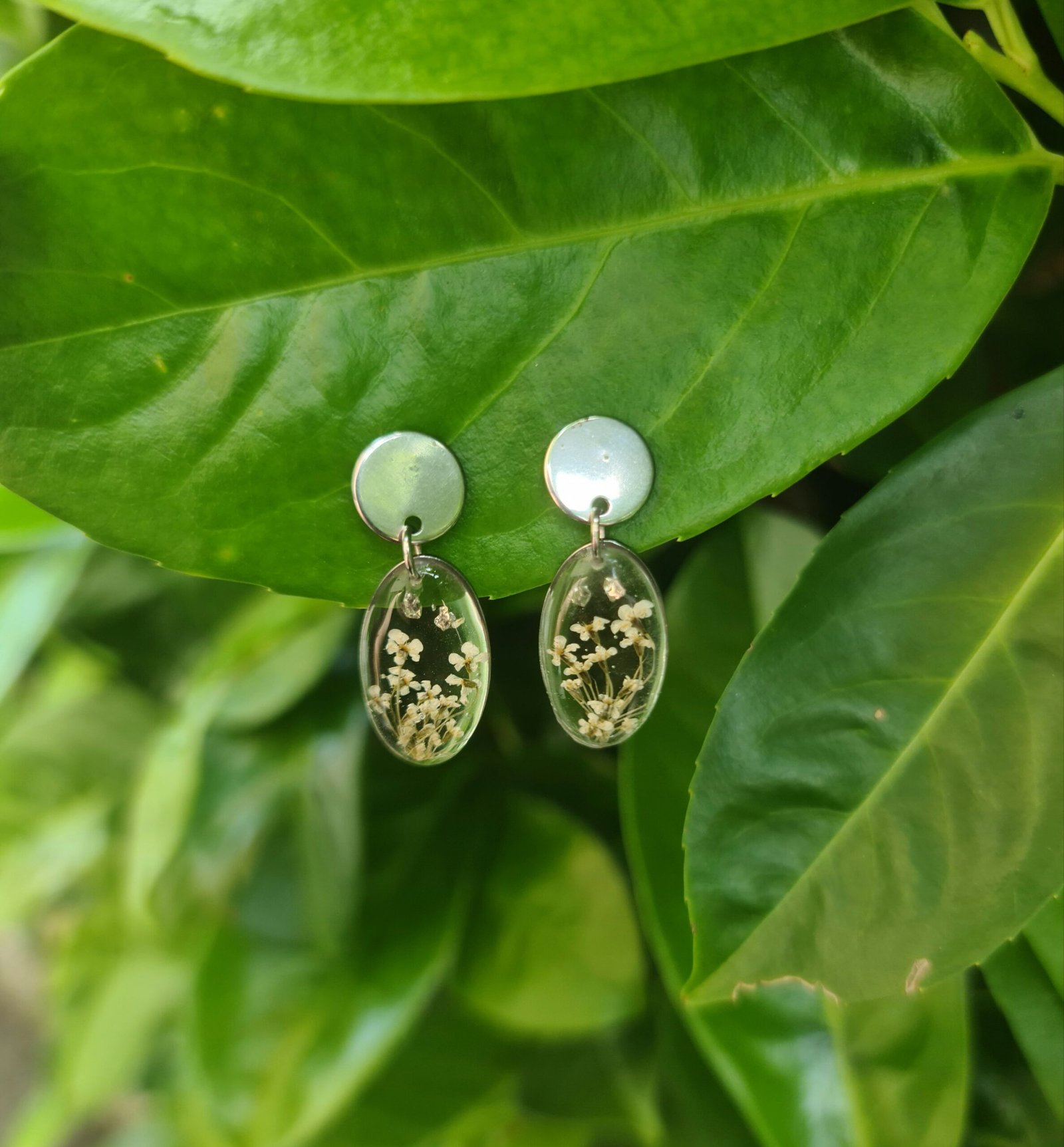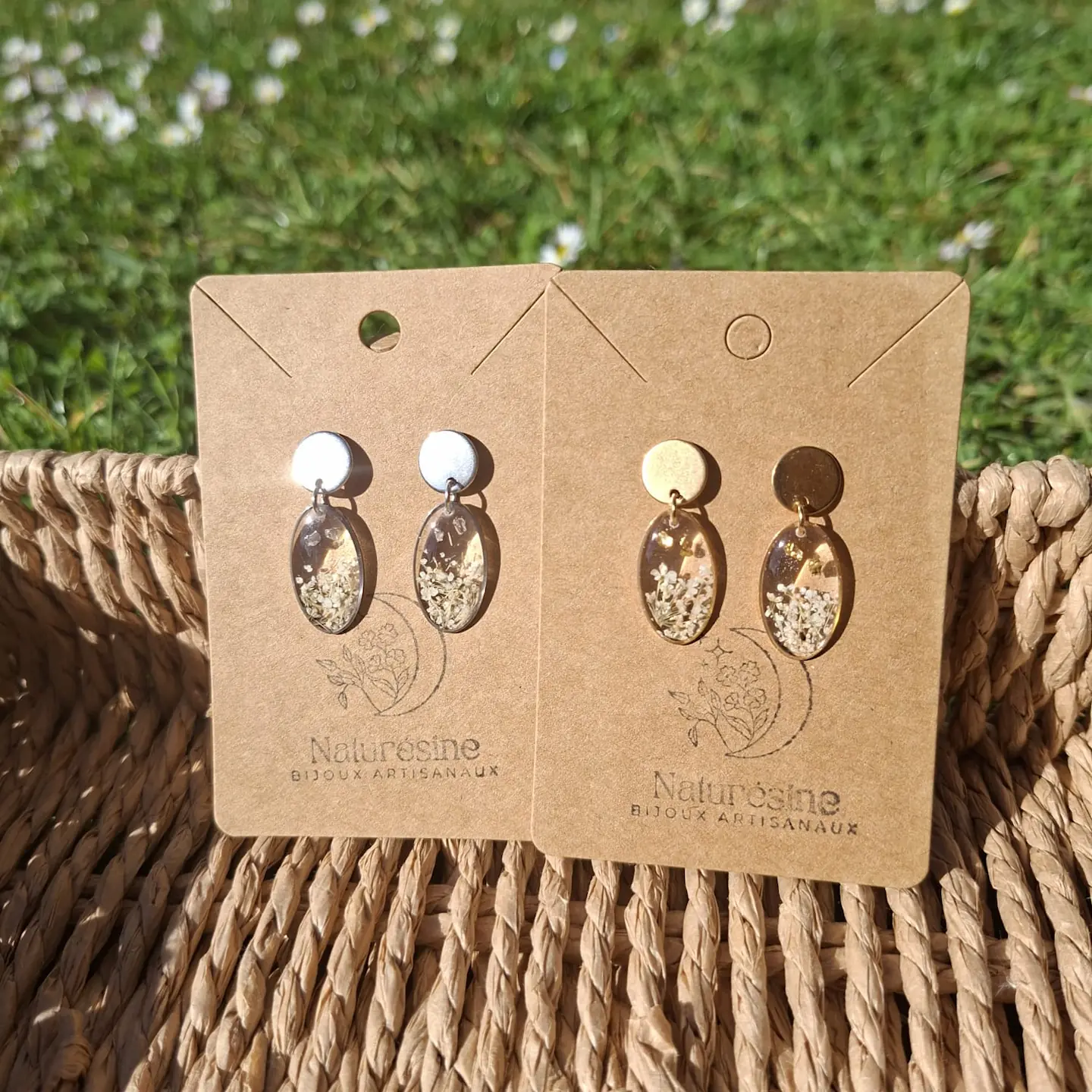 Les boucles d’oreilles Malaga présentent un pendentif ovale en résine transparente intégrant de véritables fleurs séchées aux teintes naturelles.