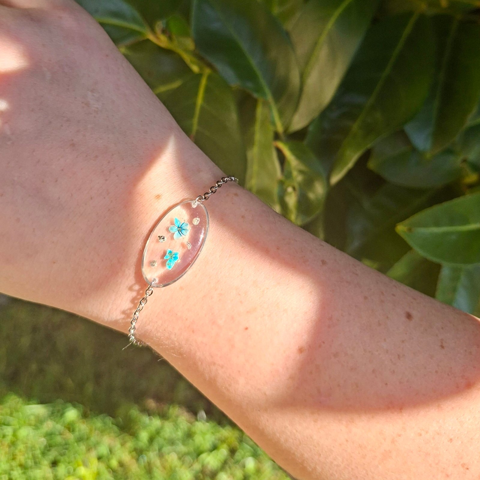 Le bracelet Bluette est composé de magnifiques fleurs bleues naturelles conservées dans la résine. Ce bijou est un modèle coloré tout en restant discret.
