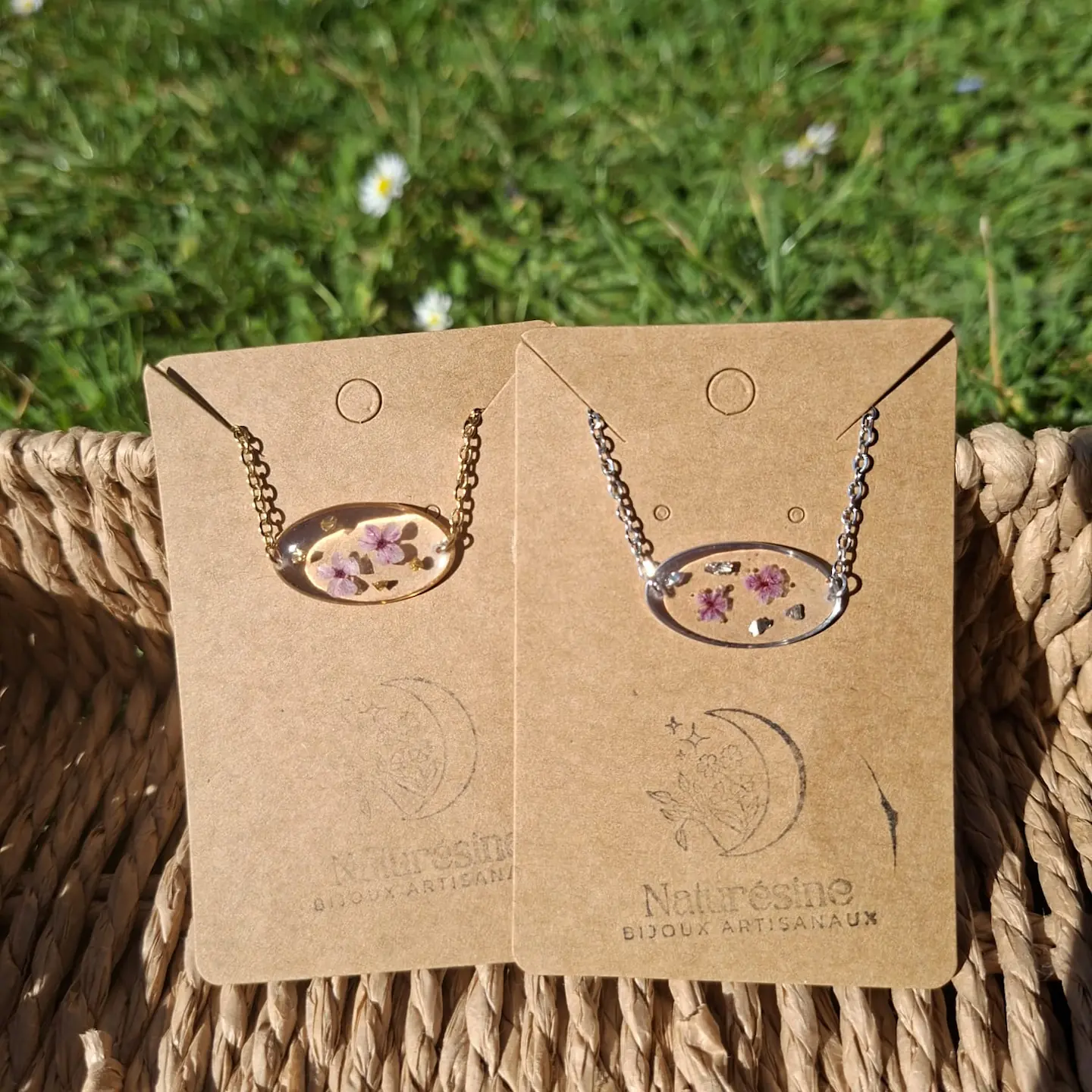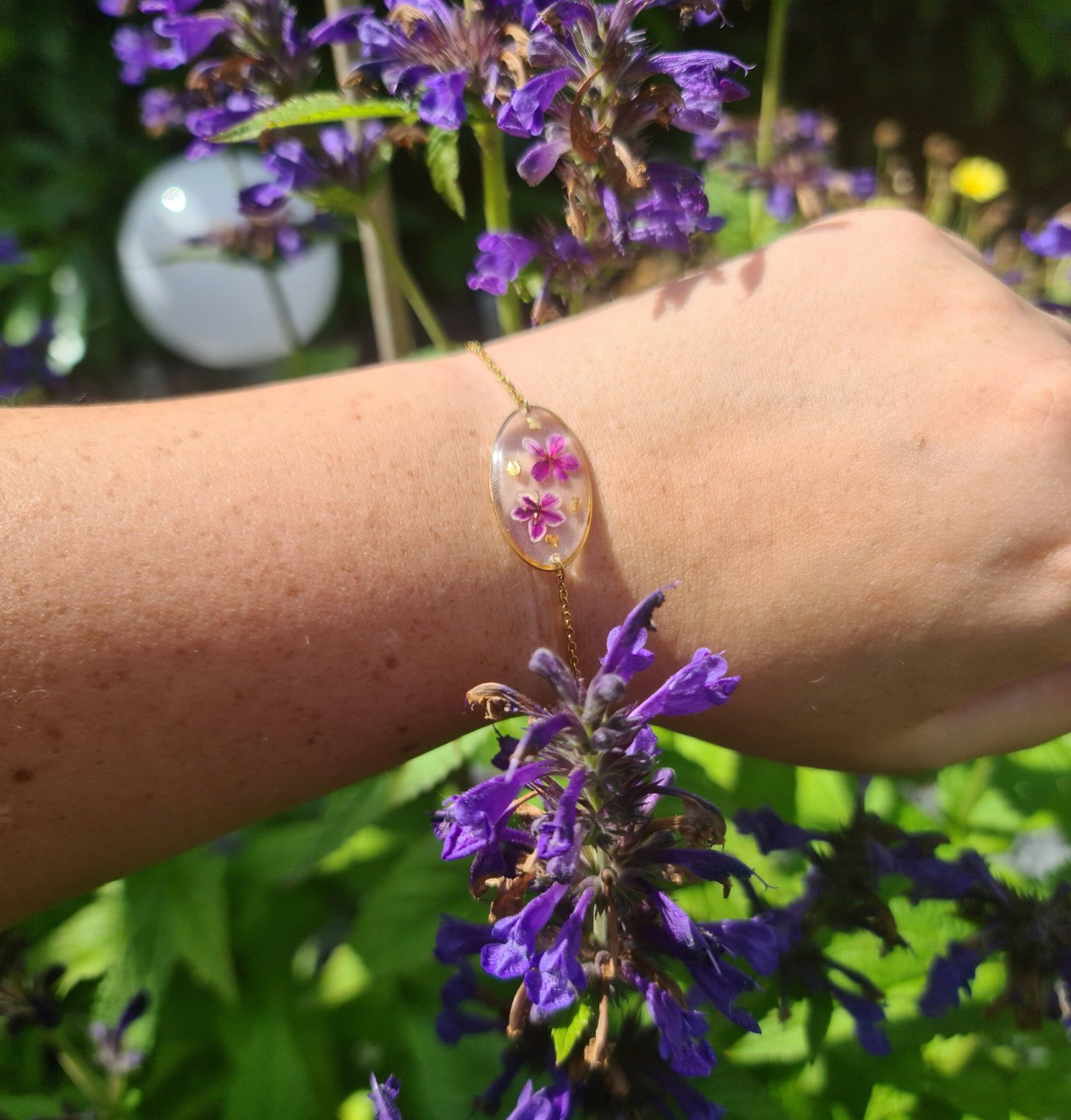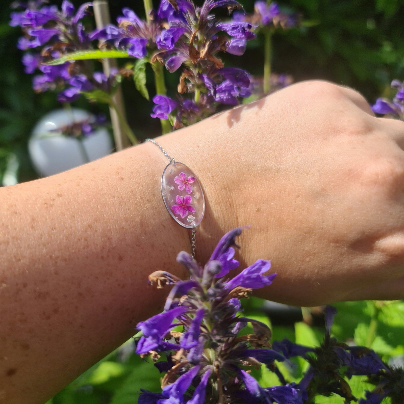 Le bracelet Flora présente un médaillon ovale en résine transparente intégrant de véritables petites fleurs séchées aux teintes violettes, délicatement mises en valeur par la lumière.