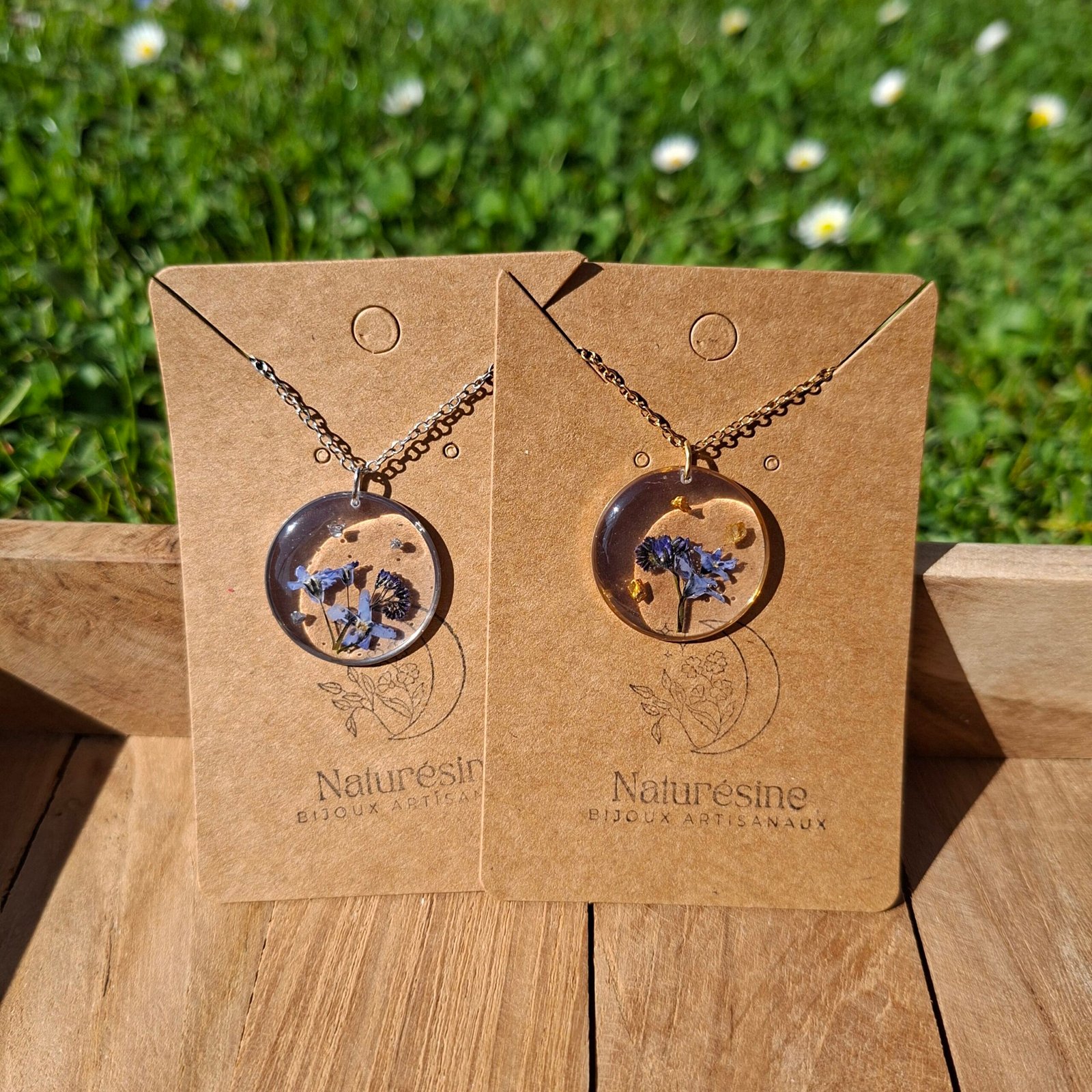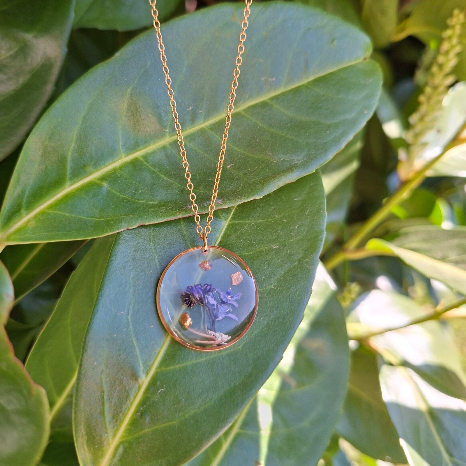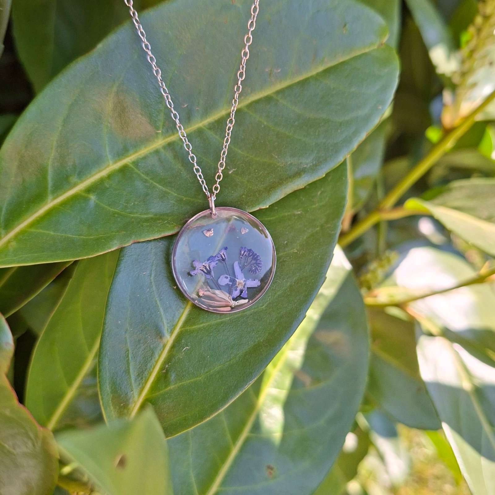 Le collier Tessy est créé avec de véritables fleurs bleues naturelles séchées et intégrées dans la résine.